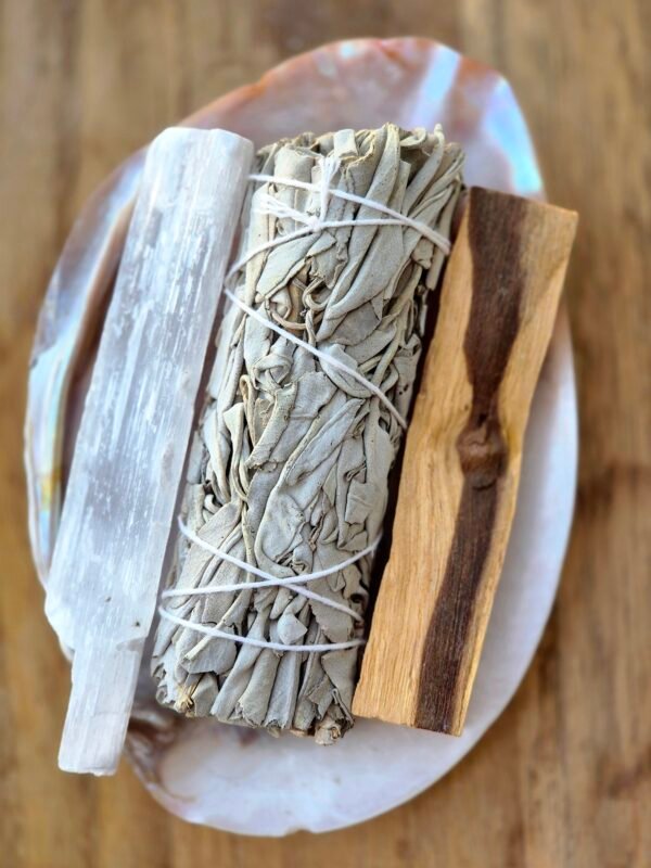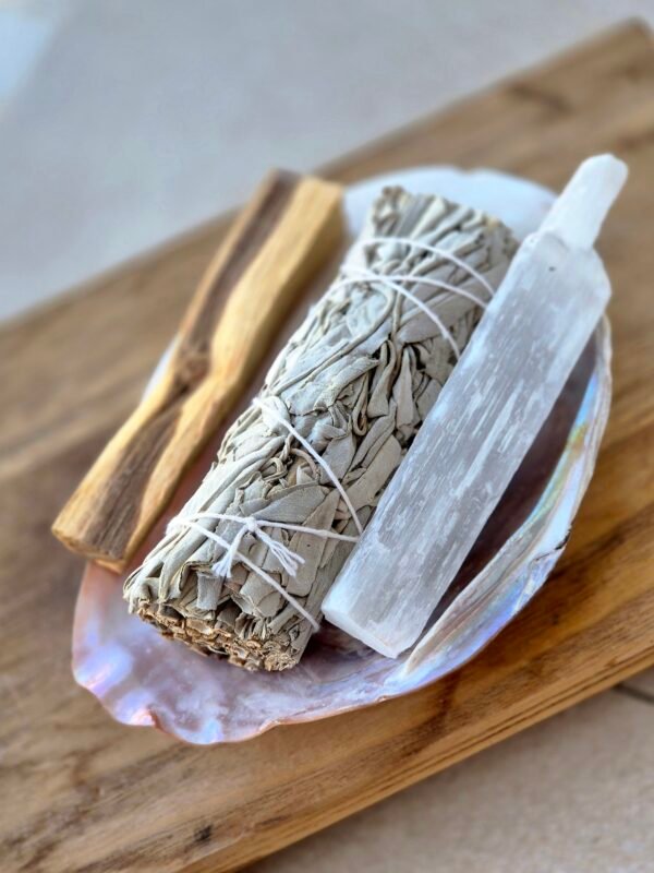 מגש הצדפה מחזיק את הטקס ביופי טבעי, המרווה מטהרת אנרגיות תקועות וכבדות, הפאלו סאנטו מזמין אור ורכות ופותח תדר של אהבה והרמוניה בתוך המרחב.
